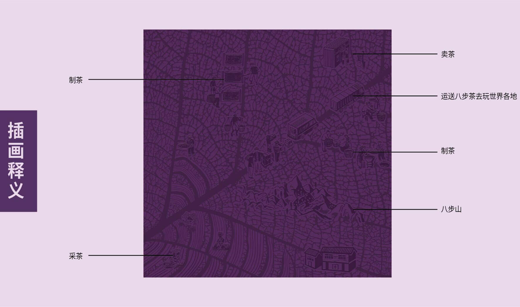 茶園、采茶、制茶、賣茶、八步山等場(chǎng)景以葉脈為載體,表達(dá)畫面的延展性,