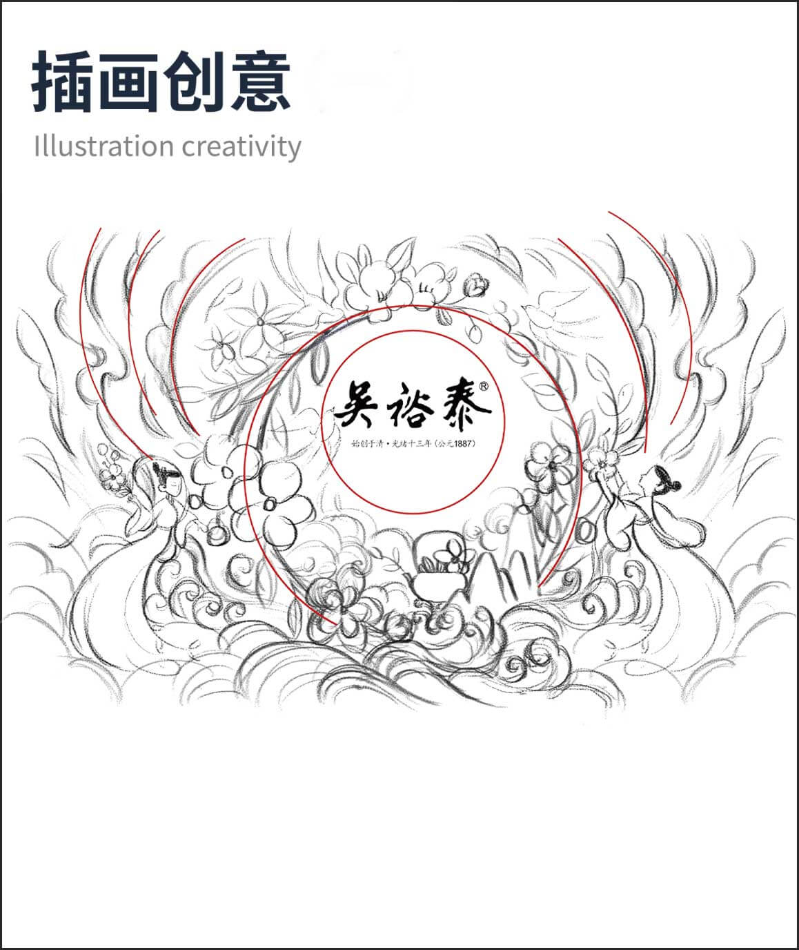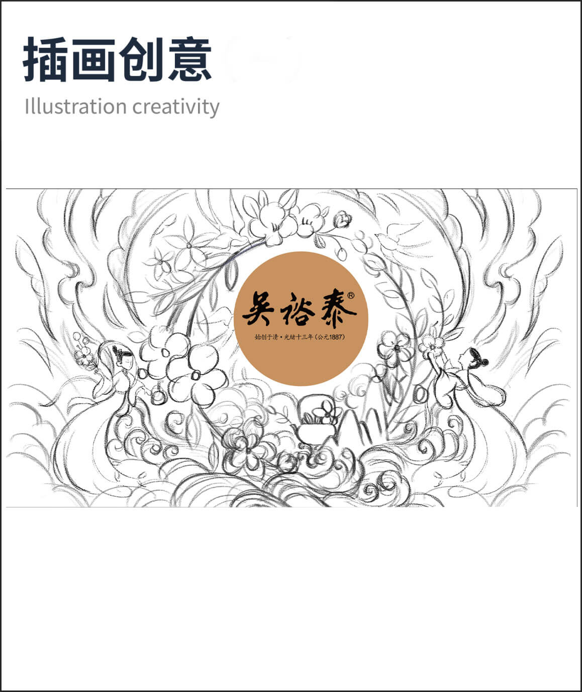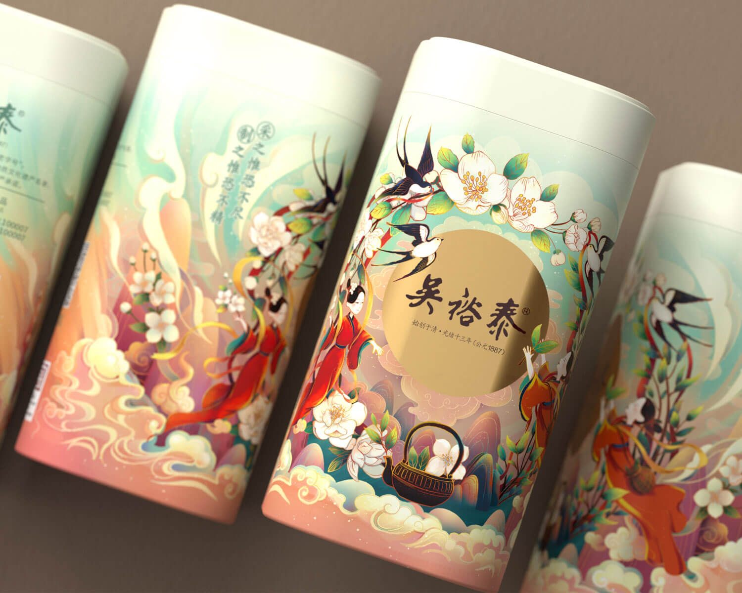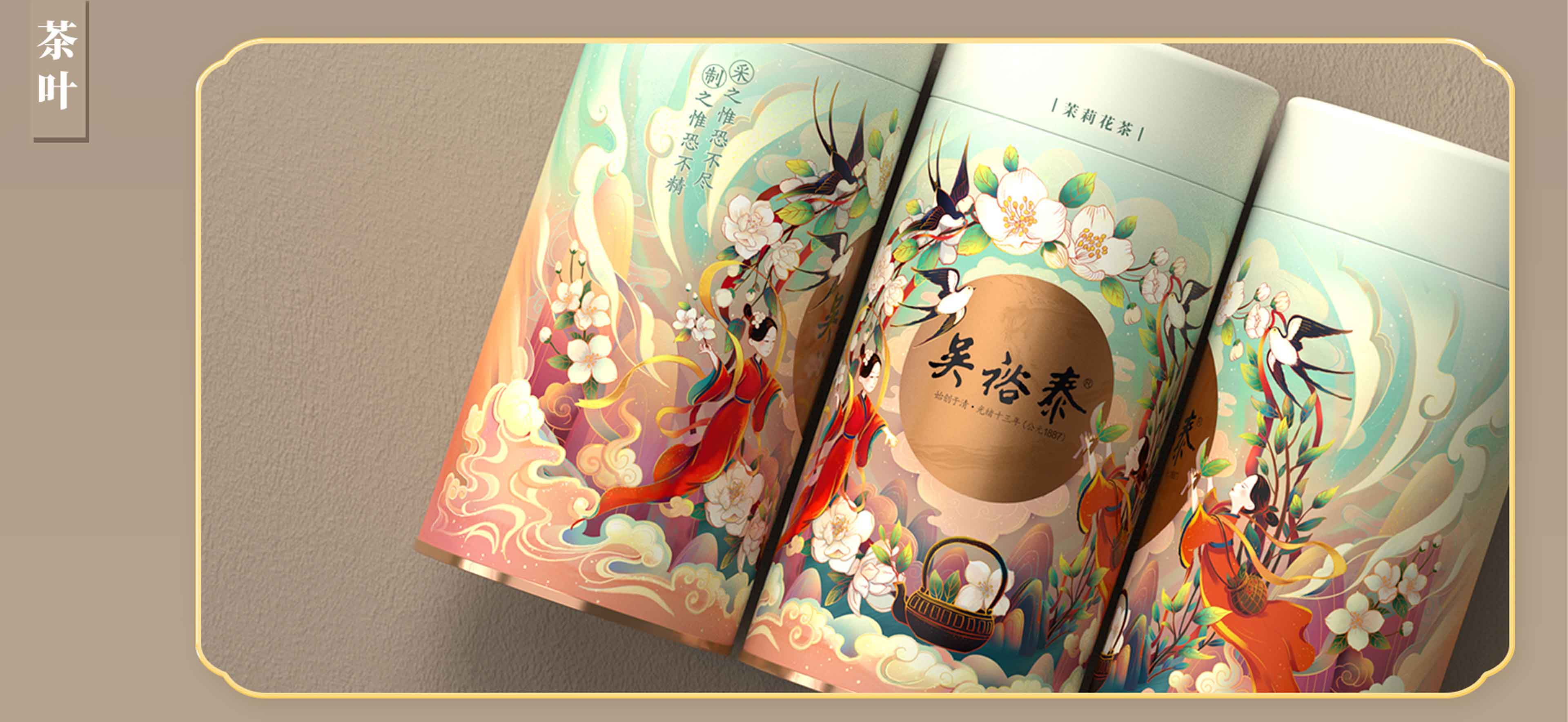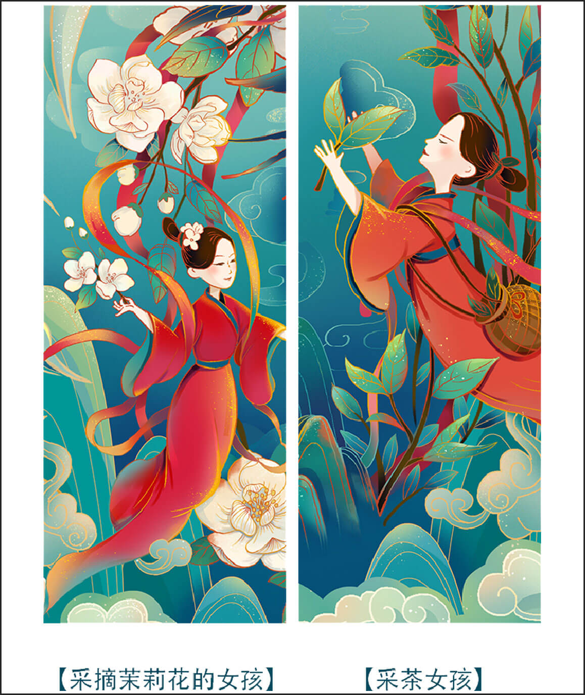 以“茉莉花”為主題元素,進(jìn)行設(shè)計(jì)創(chuàng)作,以國(guó)潮風(fēng)格為基調(diào),輔助山川、流水、茶葉、采茶姑娘、燕子等元素,賦予插畫(huà)更多的故事性和閱讀性。