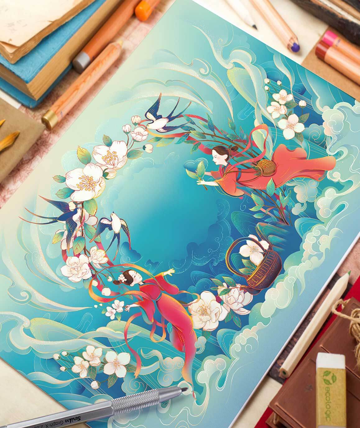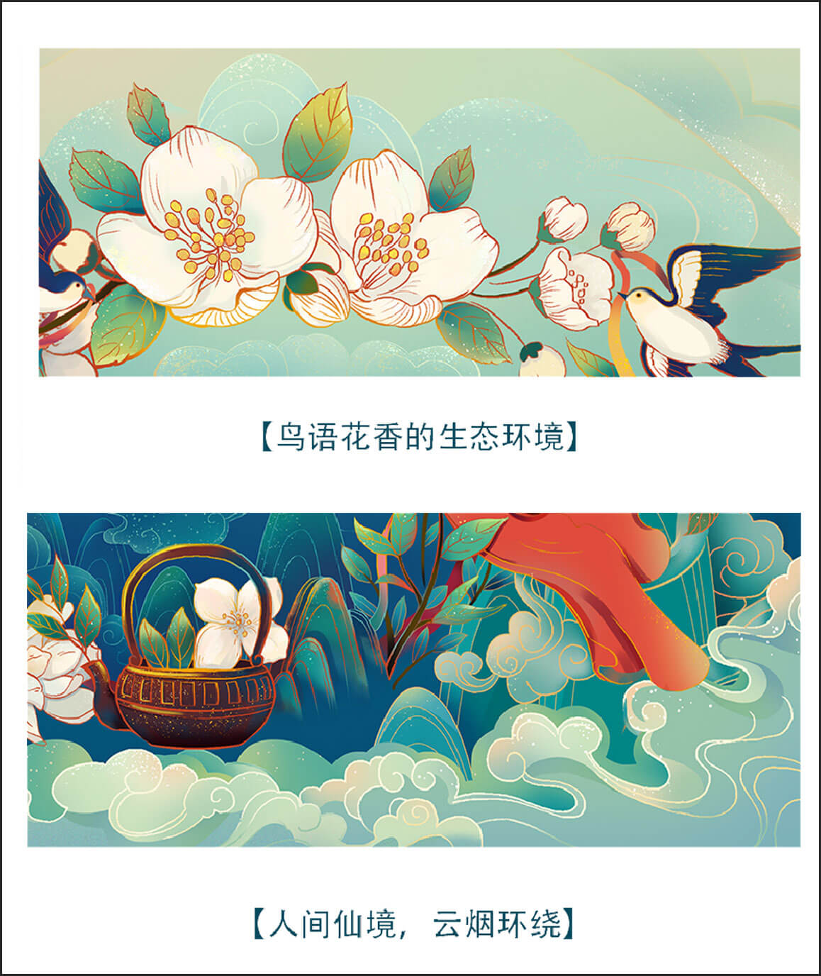 插畫(huà)以新國(guó)潮風(fēng)格繪制畫(huà)面描繪了“云煙環(huán)繞、鳥(niǎo)語(yǔ)花香"的生態(tài)環(huán)境里采茶與采花的女孩。