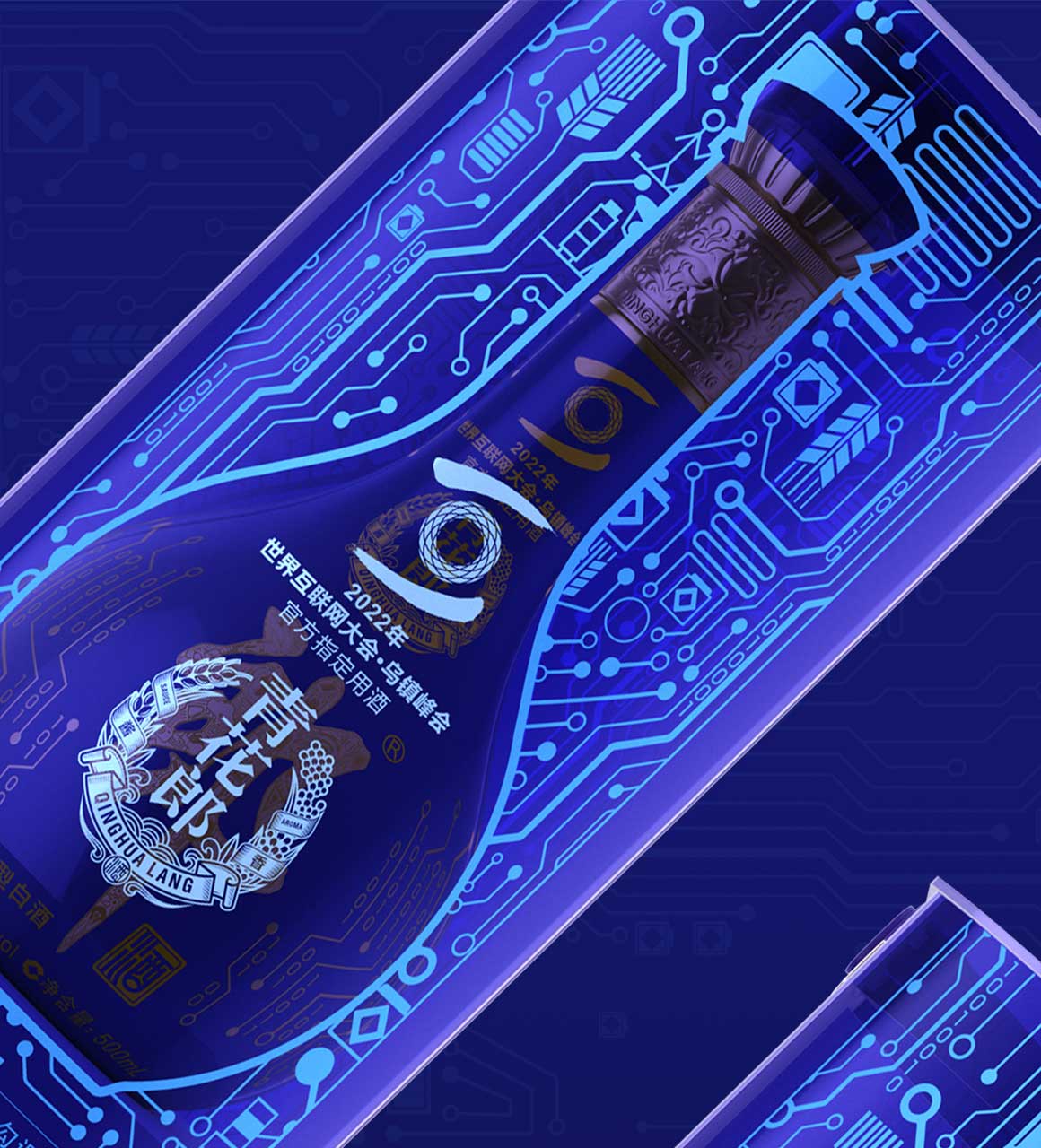 電路板,為后面的芯片發(fā)明奠定了基礎(chǔ),人類(lèi)迎來(lái)真正的互聯(lián)網(wǎng)+時(shí)代,“科技郎”外形設(shè)計(jì)上嵌入芯片、電路板紋理元素同時(shí)加入糧食、工藝、酒曲、酒壇等釀造元素進(jìn)行提煉再設(shè)計(jì)。