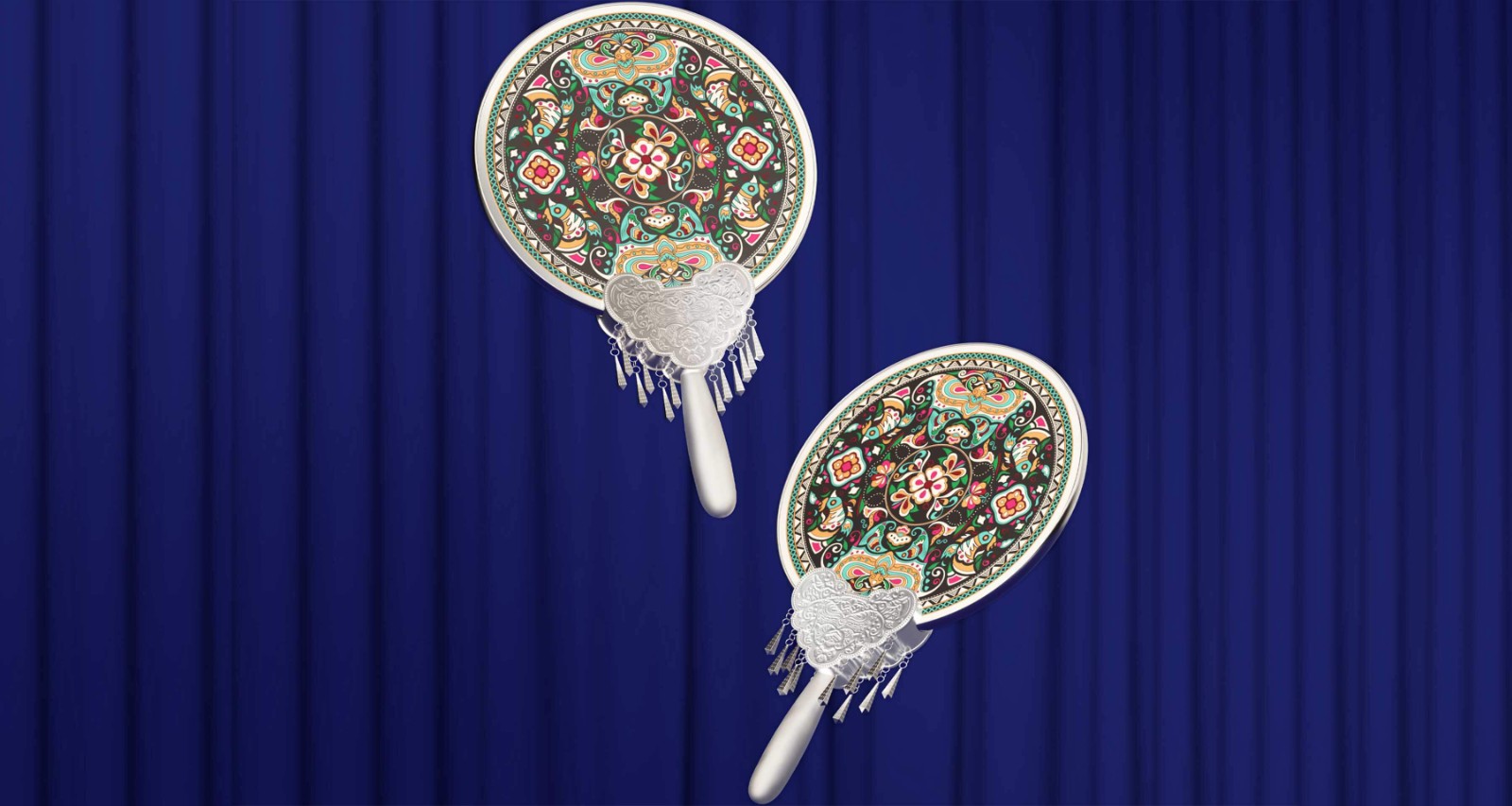 貴州苗繡是中國(guó)苗族民間傳承的刺繡技藝,也是苗族歷史文化中特有的表現(xiàn)形式之一,在苗繡圖案方面,最典型的當(dāng)屬蝴蝶紋樣同時(shí)非常講究對(duì)稱美。為此在團(tuán)扇配品設(shè)計(jì)創(chuàng)作中,我們以中式對(duì)稱美學(xué)出發(fā),以苗繡蝴蝶紋樣為主視覺,呈現(xiàn)一個(gè)古典、和諧的苗繡團(tuán)扇。