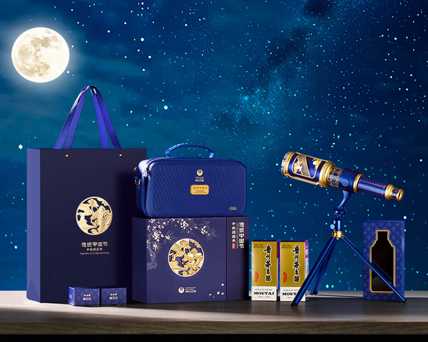 望遠(yuǎn)鏡設(shè)計(jì)靈感源自茅臺(tái)酒瓶型,巧妙融合中秋文化。標(biāo)牌圖案結(jié)合茅臺(tái)經(jīng)典斜線標(biāo)與唐代月宮紋鏡,融合嫦娥、玉兔、桂花、圓月等元素,彰顯茅臺(tái)與中秋的獨(dú)特聯(lián)結(jié)。