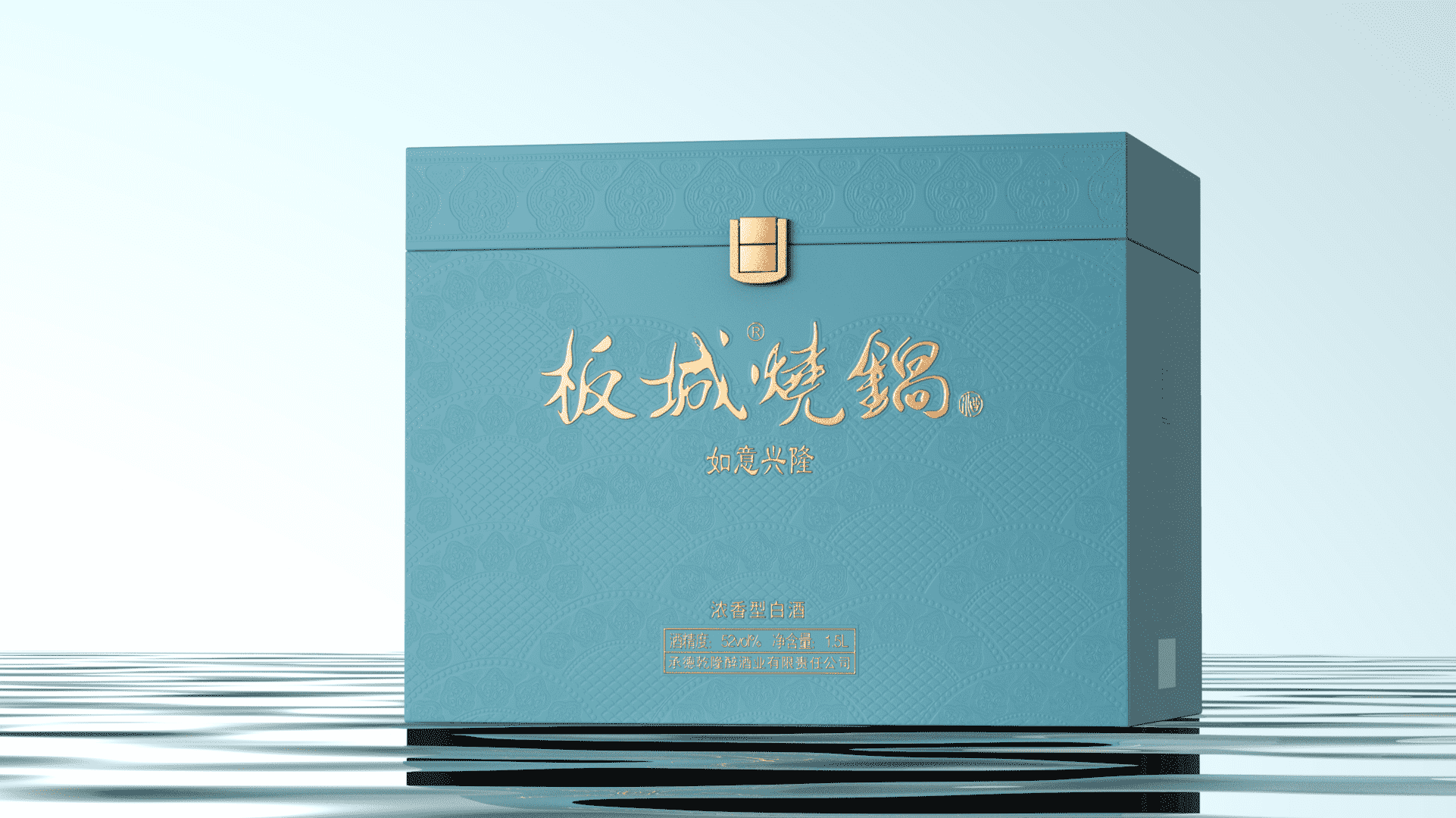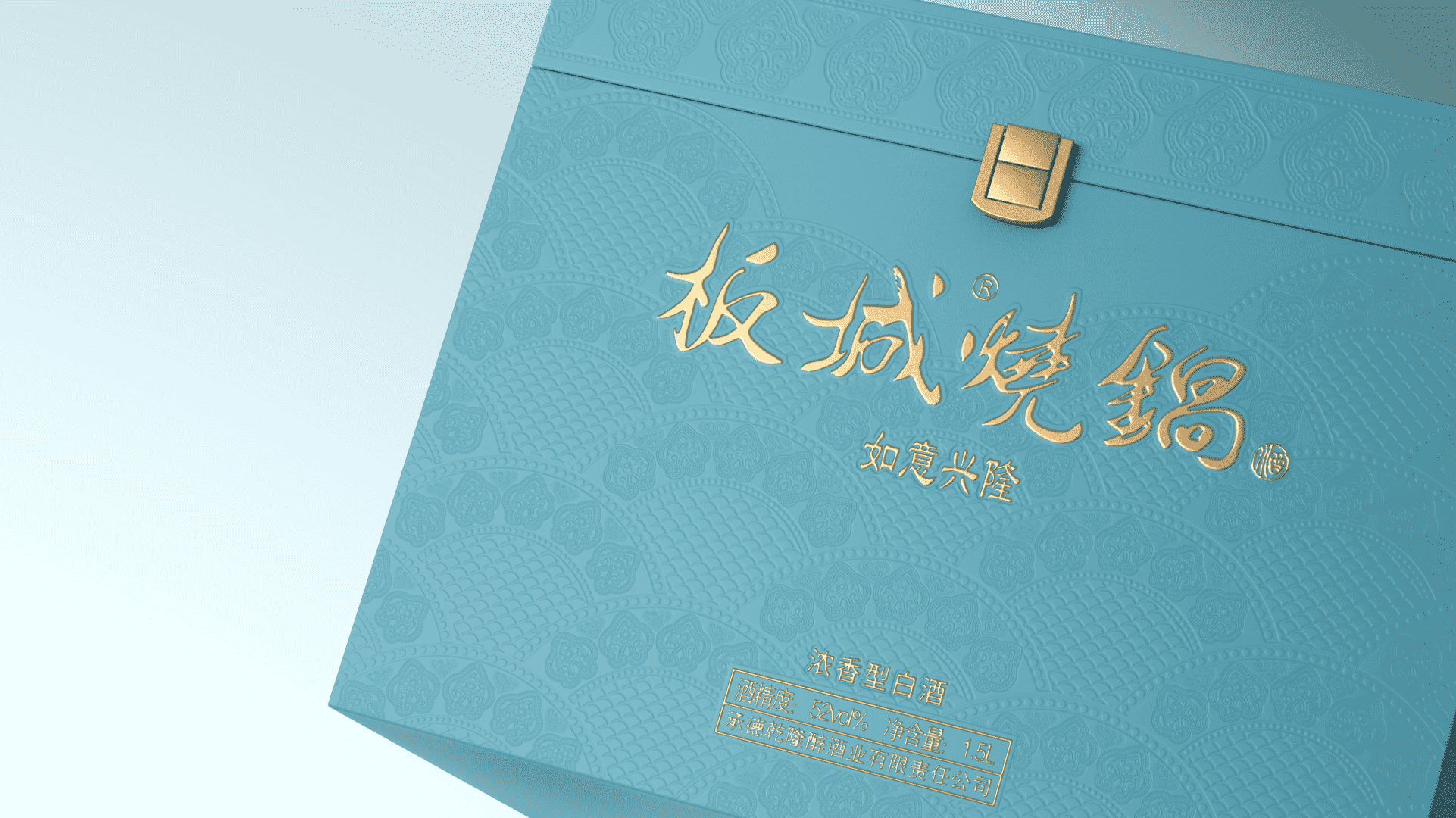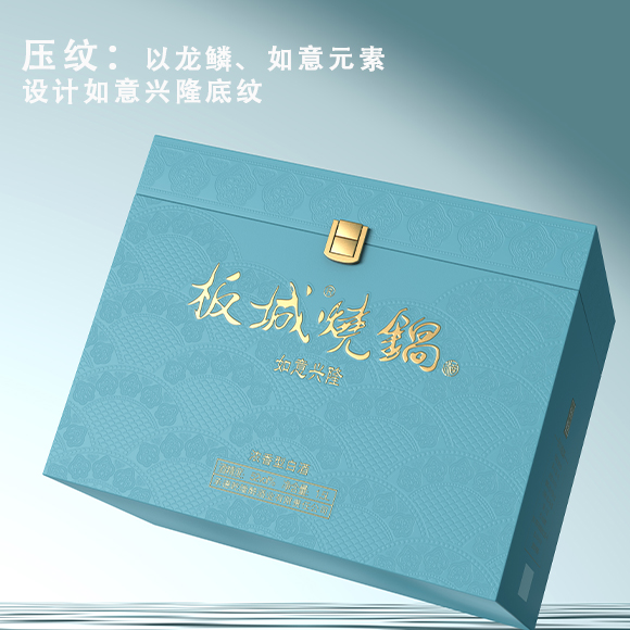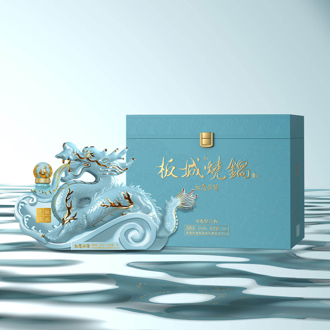 板城燒鍋如意興隆生肖酒外包裝的創(chuàng)作上,以龍鱗、如意元素細節(jié)作為底紋設(shè)計主視覺,并以壓紋工藝輔助呈現(xiàn)。