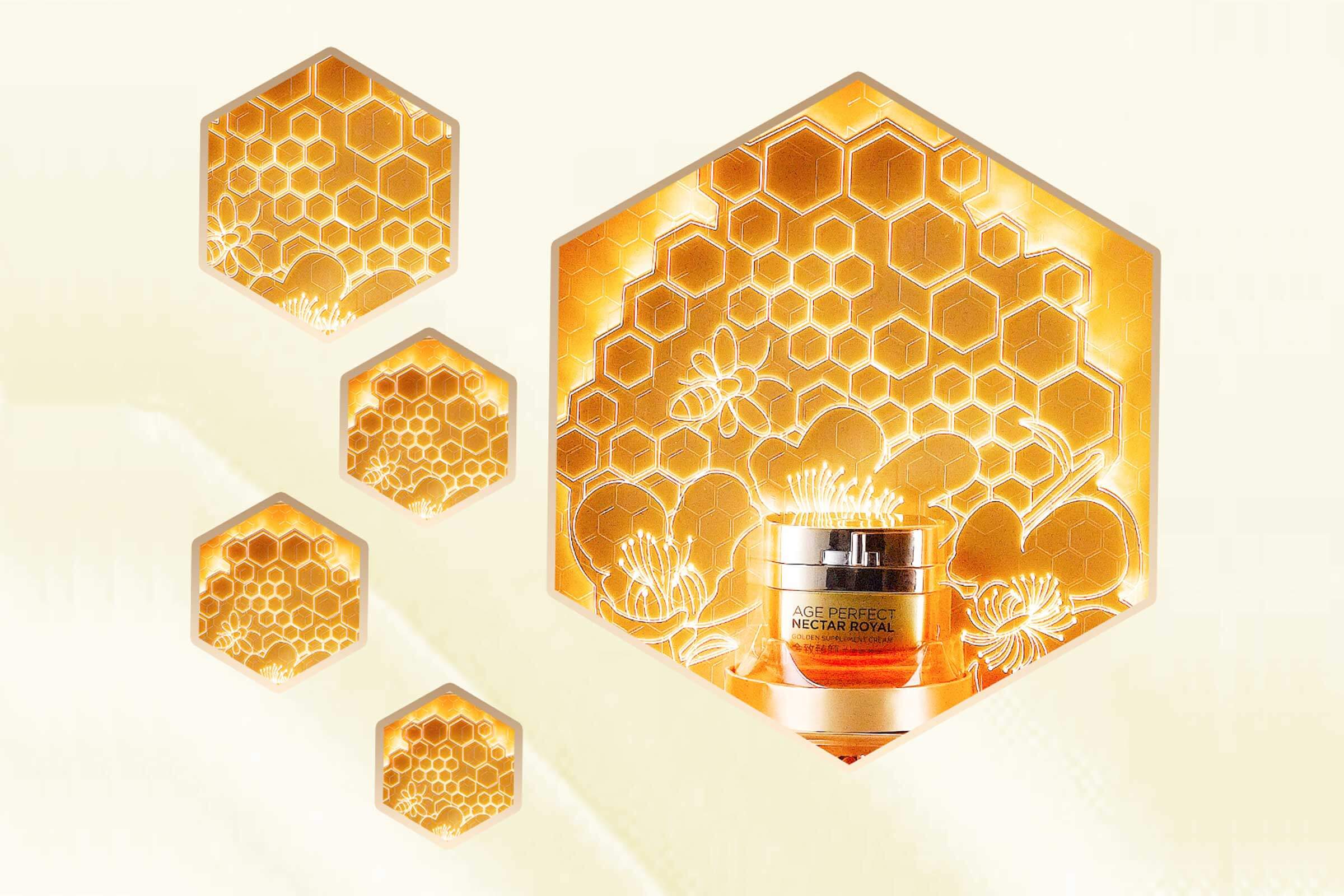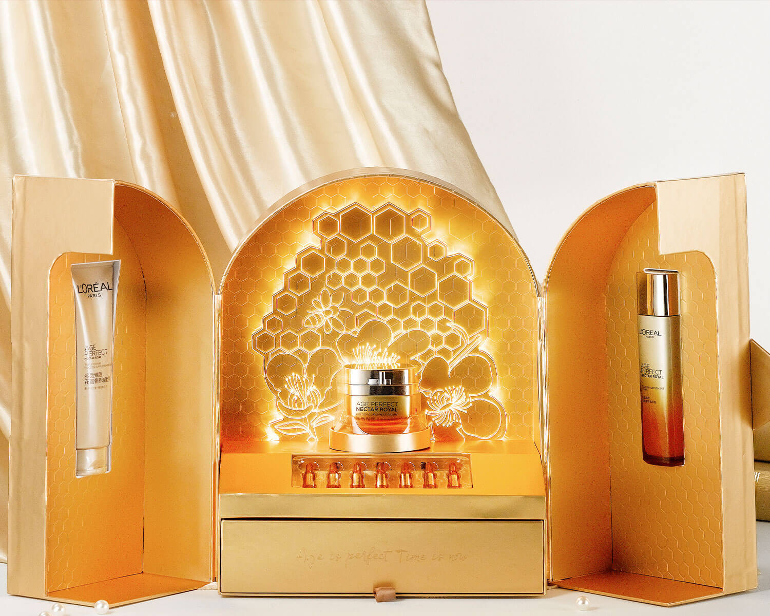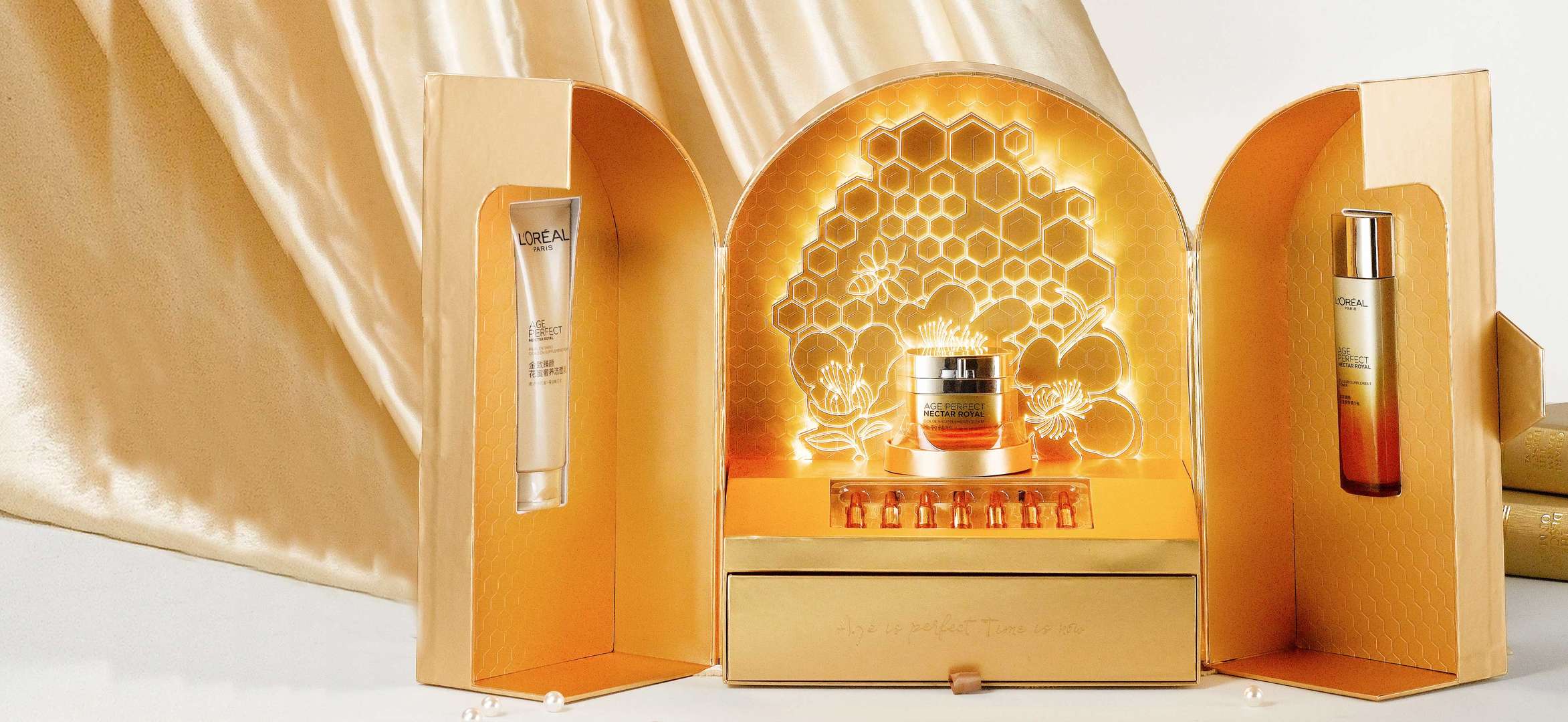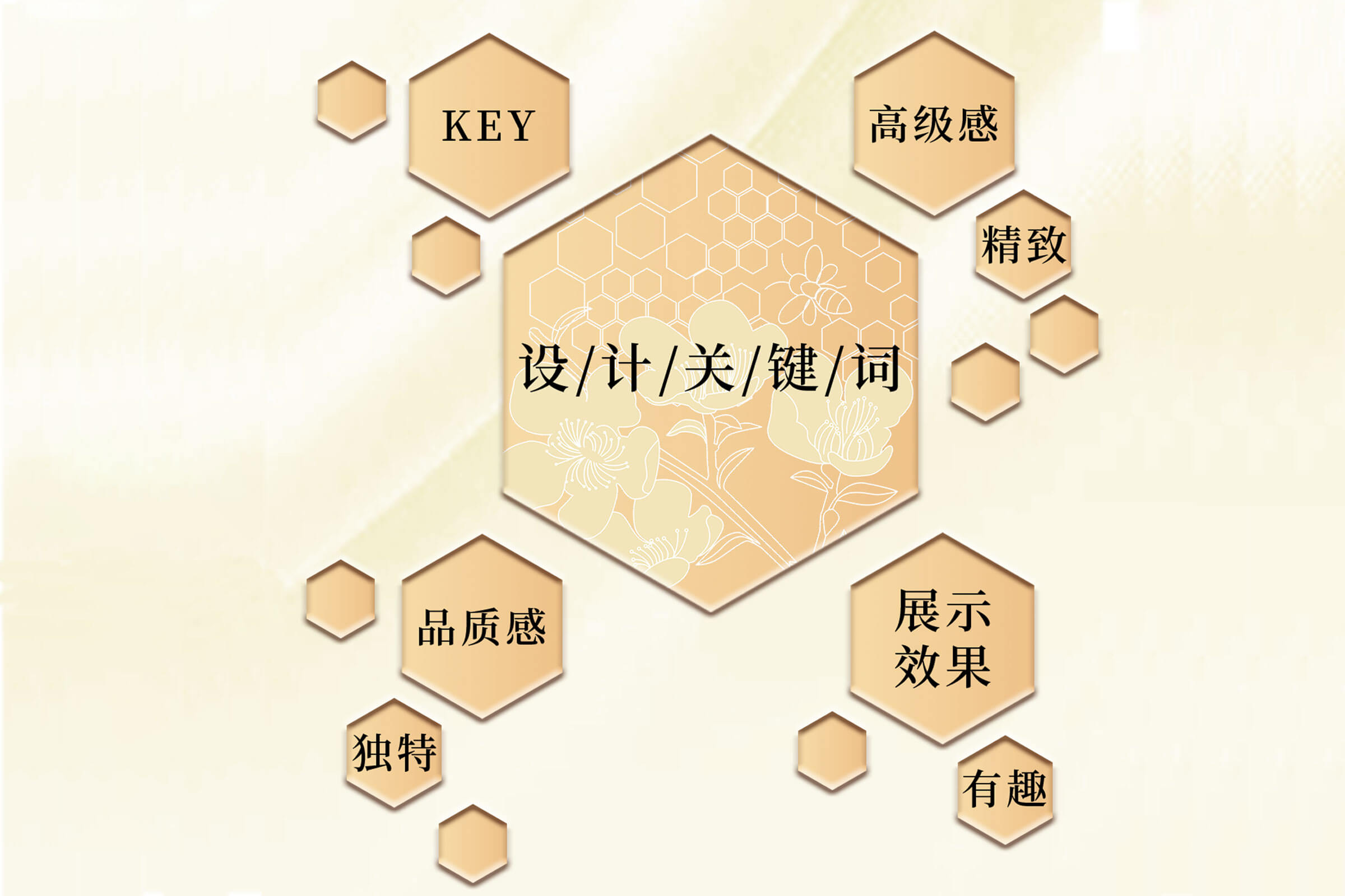 以蜂箱為靈感外盒,蜂巢線條勾勒圖形,彰顯產(chǎn)品高機能特性,細節(jié)豐富視覺,盡顯精致審美。宮廷風格與燦金配色相映成趣,圓潤弧度外殼充滿期待之力。內(nèi)藏高顏值產(chǎn)品與細膩設(shè)計,蜂巢圖案融合麥盧卡花與蜂蜜,燈光映照下,展示效果絕佳。