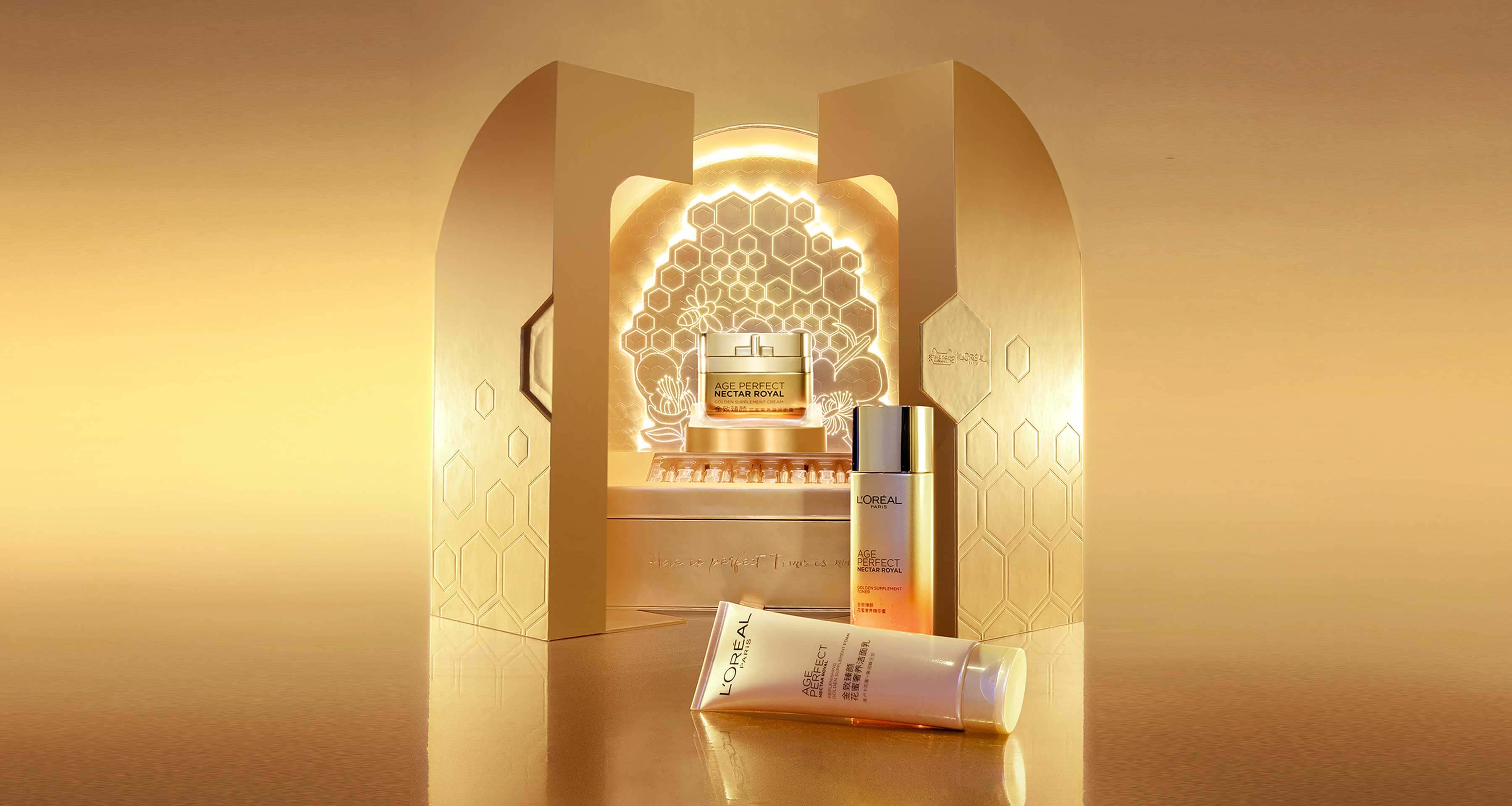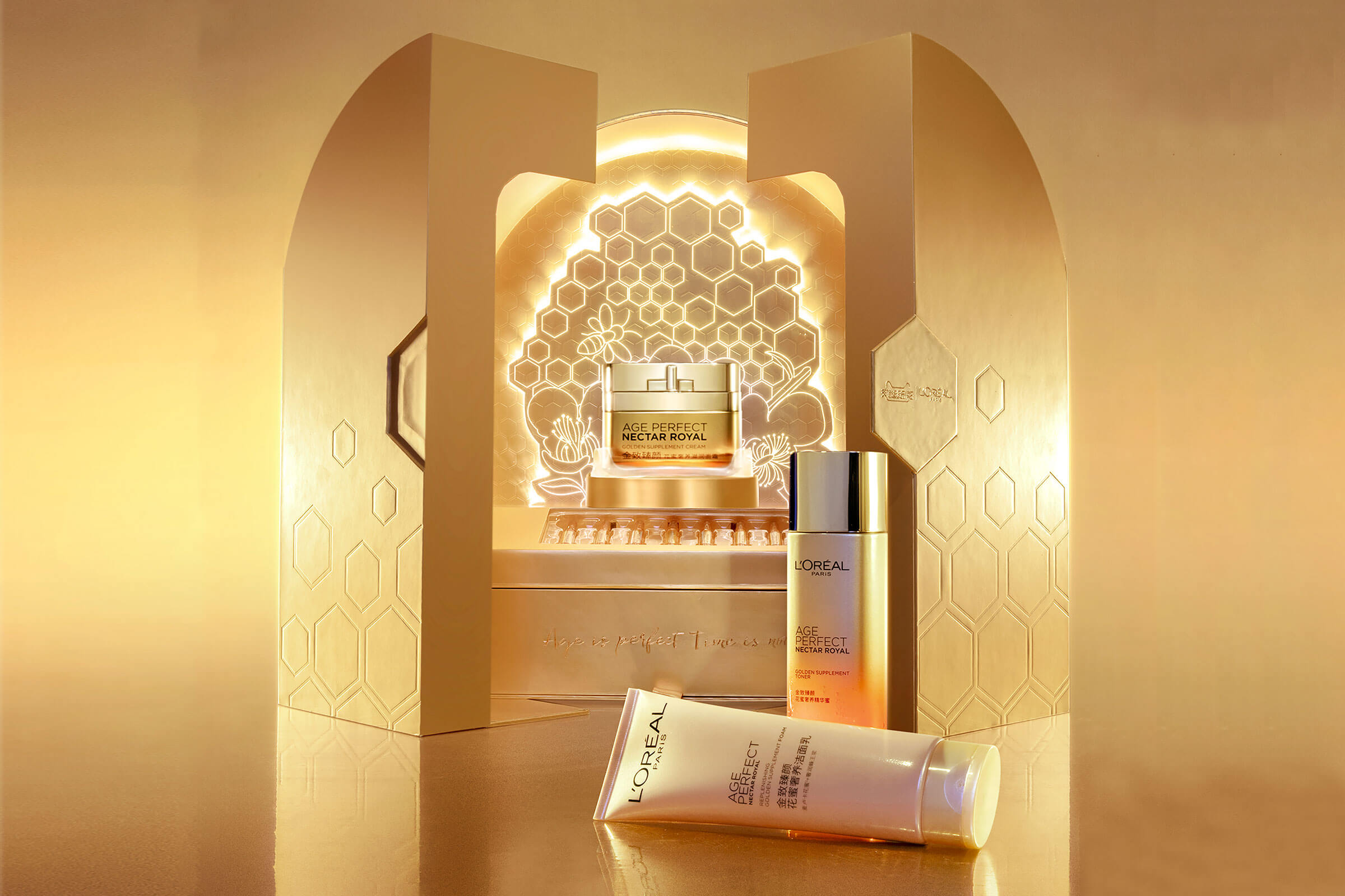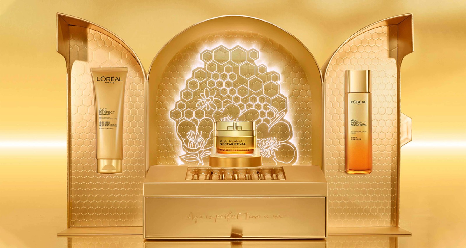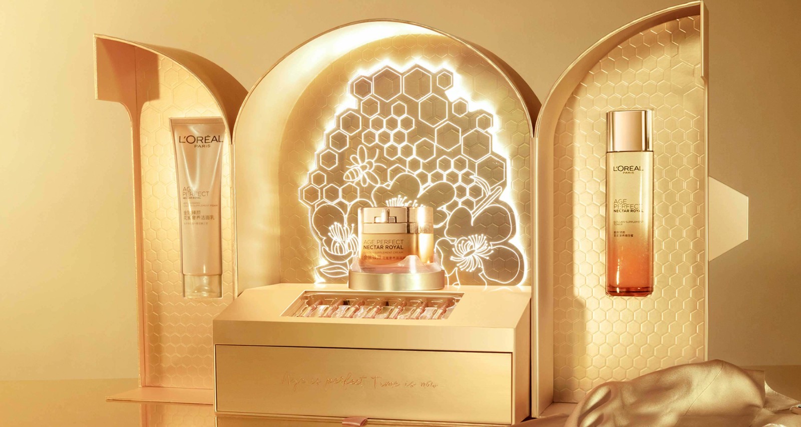 以蜂箱為靈感外盒,蜂巢線條勾勒圖形,彰顯產(chǎn)品高機能特性,細節(jié)豐富視覺,盡顯精致審美。宮廷風格與燦金配色相映成趣,圓潤弧度外殼充滿期待之力。內(nèi)藏高顏值產(chǎn)品與細膩設(shè)計,蜂巢圖案融合麥盧卡花與蜂蜜,燈光映照下,展示效果絕佳。