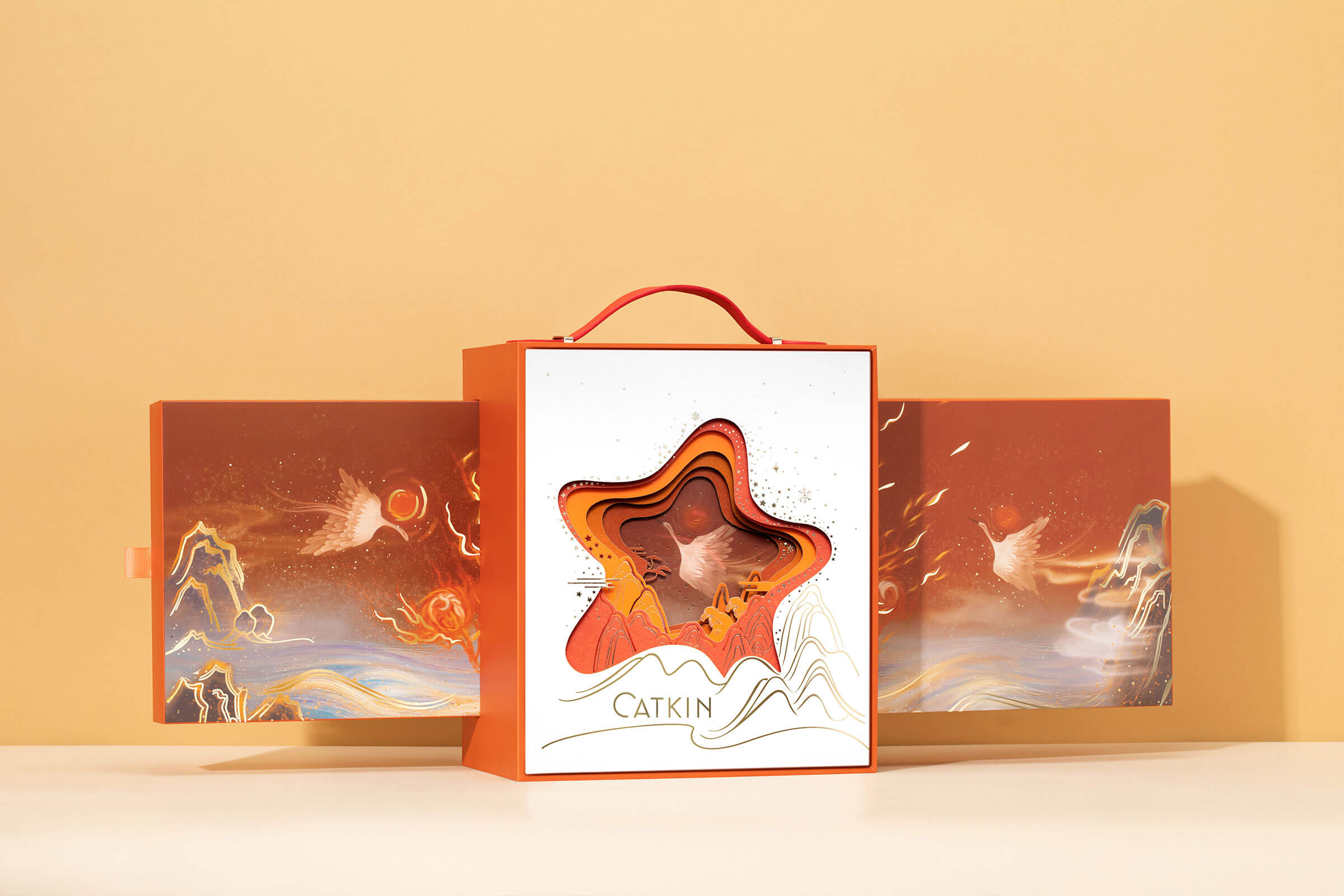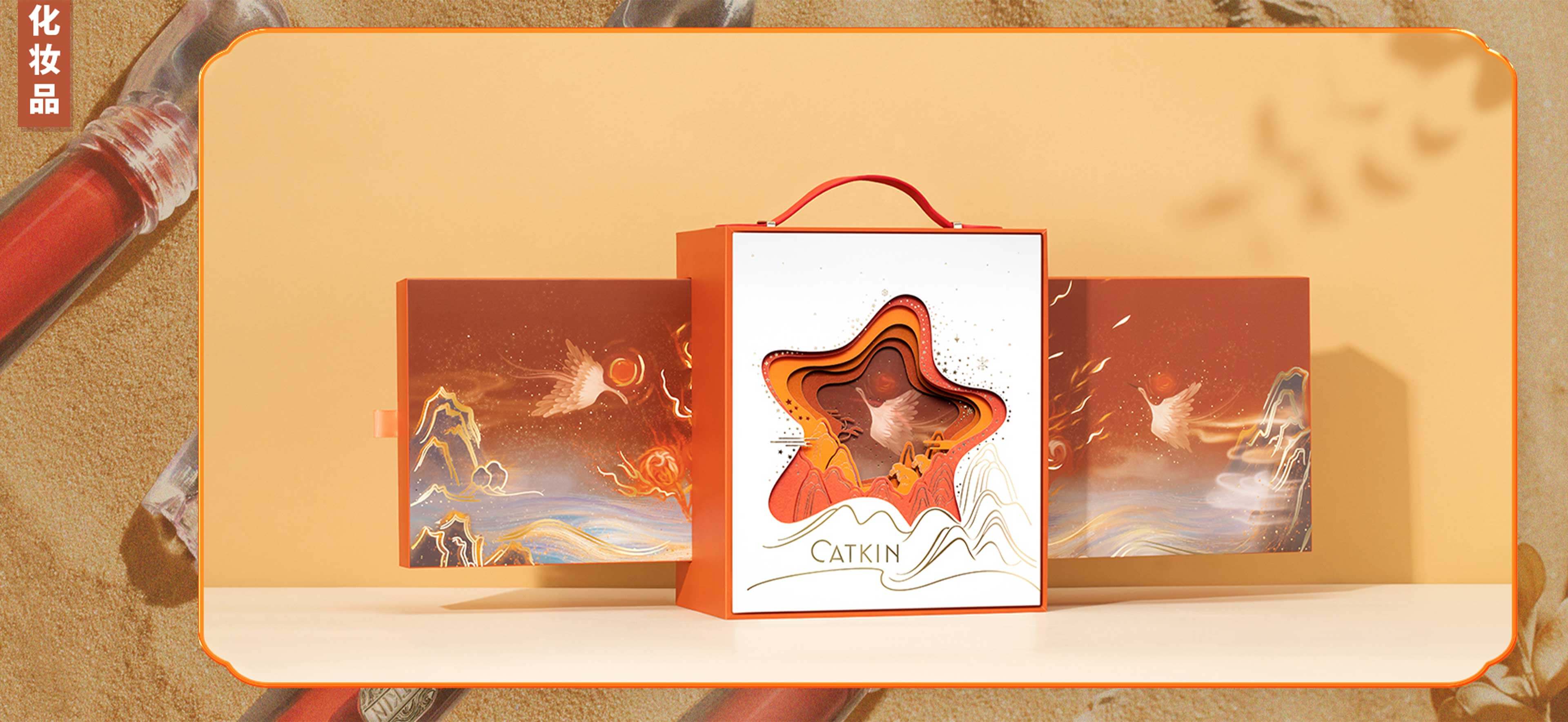 盒插畫靈感來自于《海經(jīng)·海外東經(jīng)》中的“湯谷上有扶桑,十日所浴,在黑齒北。居水中,有大木,九日居下枝,一日居上枝,并將其繪制成內(nèi)盒包裝插畫進(jìn)行展示,通過手提箱造型融入禮盒,輔以皮質(zhì)提手疊加燙金線條嵌之立體紙雕,質(zhì)感輕奢妝奩輕啟,盡收綺麗山海之美,蘊(yùn)情于禮,只為伊人。