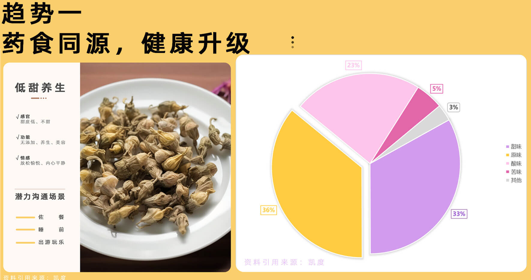 幸福之源不止于甜味,藥食同源支撐健康食材更升級。低甜、自然本真的口味特征,很好匹配“低甜養(yǎng)生”與“本味節(jié)制”消費者感官需求,適配餐后、學(xué)習(xí)等潛力場景。
